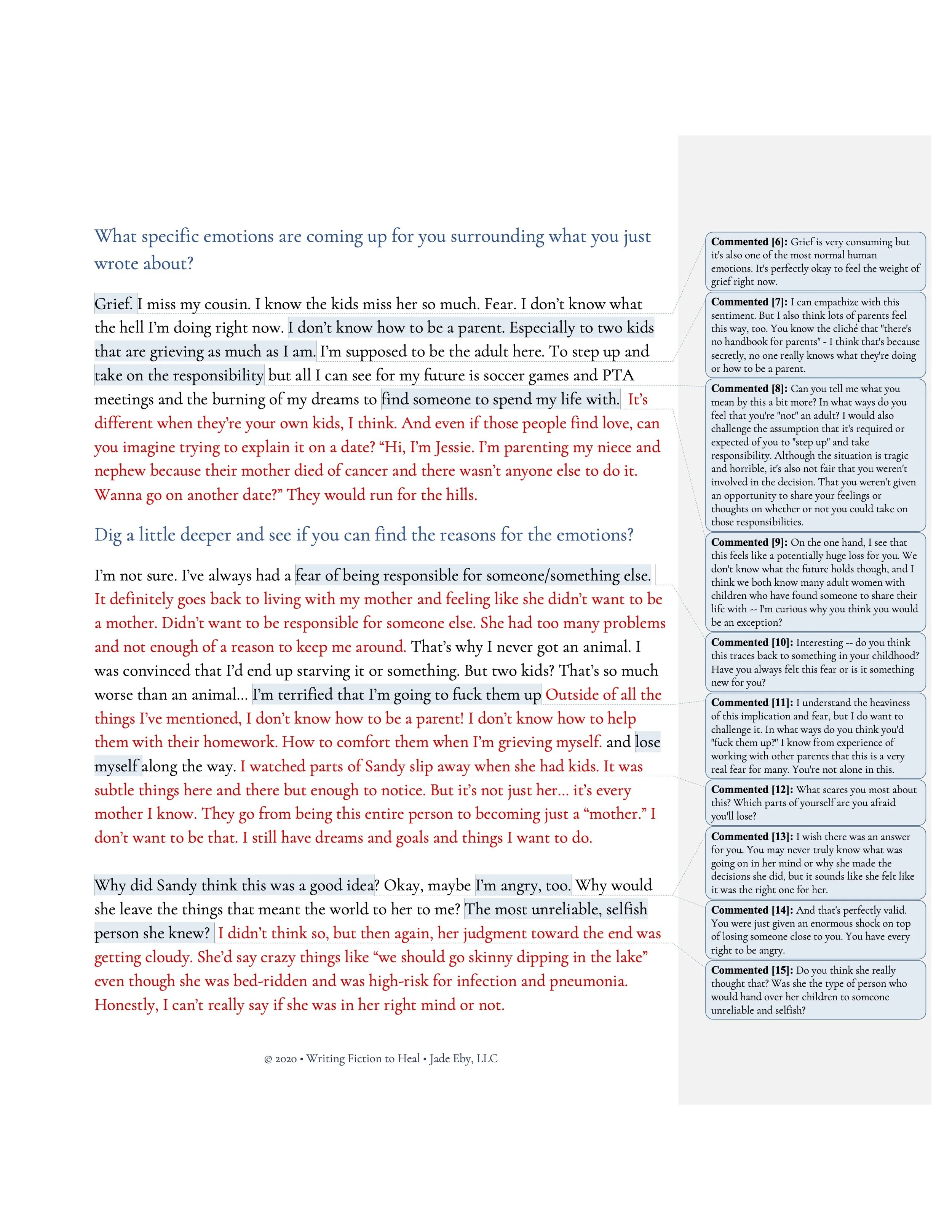 These examples are from Jessie, a client of mine who I took through the Writing Fiction to Heal method. She was kind enough to allow me to use her materials throughout the Writing Fiction to Heal Workshop but I wanted to share a few here so that you can see what collaborative storytelling coaching looks like in actual practice. [Note: My comments and questions are in the blue bubbles, the red text is her response to the comments or questions]