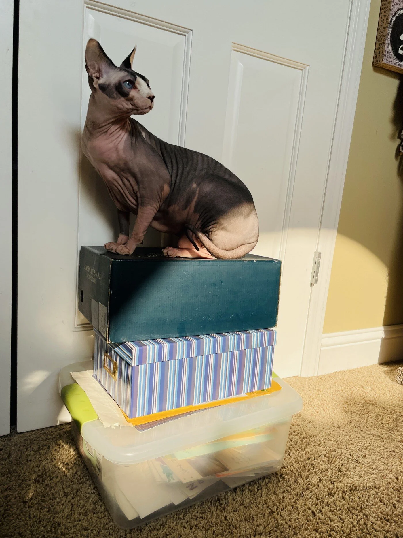 A few of the many boxes brought up from storage and my Sphynx taking part in it.