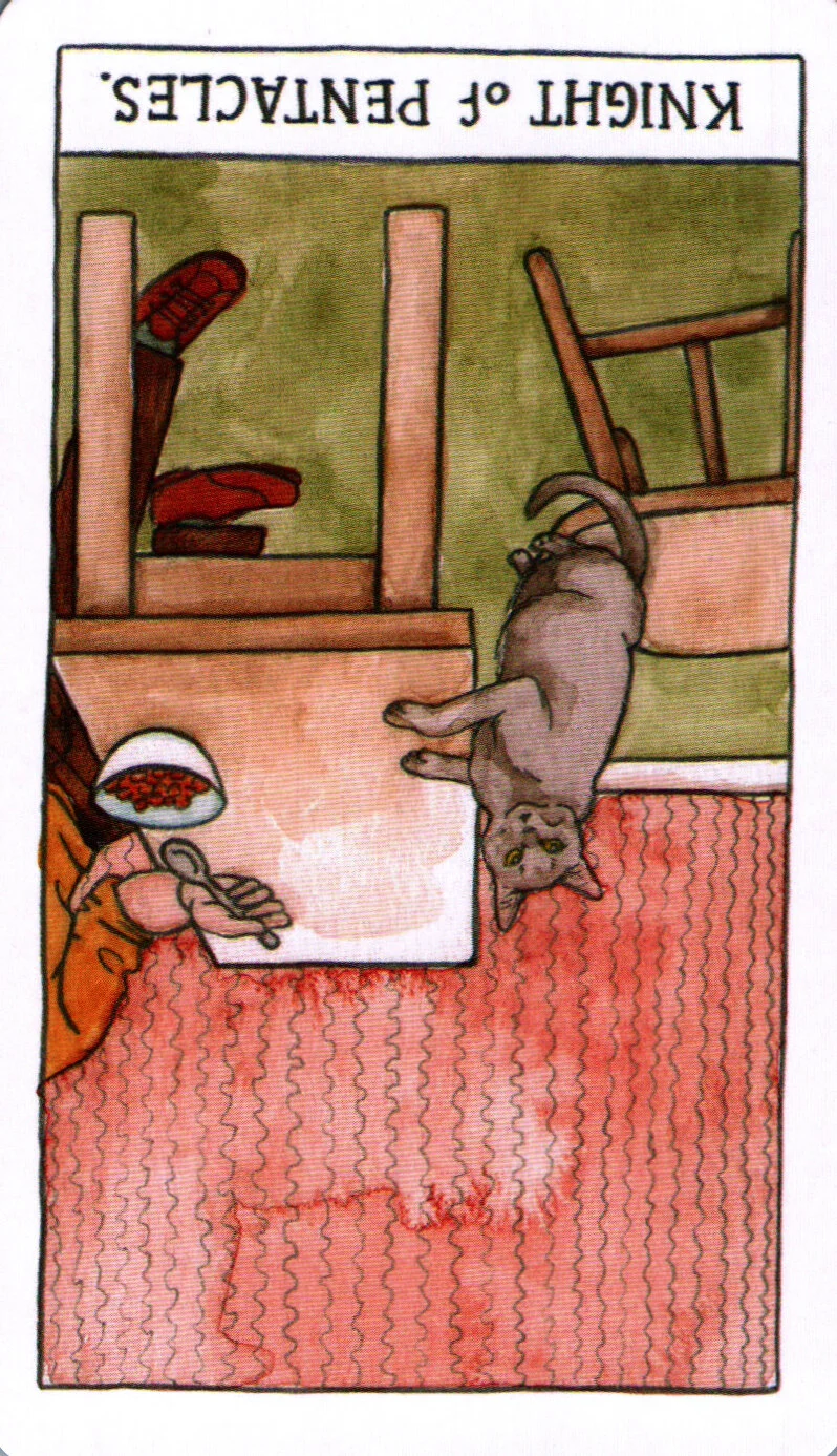 The Fool, reversed, for this question is perfection for this deck, in my opinion. The guidebook says: The Fool reversed reminds us not to take life too seriously. I think that perfectly encapsulates what personality this deck has — fun, a bit foolish, not to be taken too seriously. Knight of Pentacles, reversed tells me that this deck's strength comes in the form of reconsidering the approach. This is not a traditional deck (though it does follow traditional RWS form), but it's irreverent, fun, tongue-in-cheek. Because of that, using it when things seem too "serious" may actually be a helpful approach. Well, the Page of Swords is literally about keeping someone on their toes, so I have a feeling there's going to be a lot of fun when using this deck, but I'm getting the sense, it's not going to be a deck I use for a lot of "serious" inquiries. I'm laughing so hard right now, because The Hermit is my birth card, Cats are my power animals, and really cats are magnificent Hermit's are they not? The description for the reversal of The Hermit is actually a fantastic answer to this question: