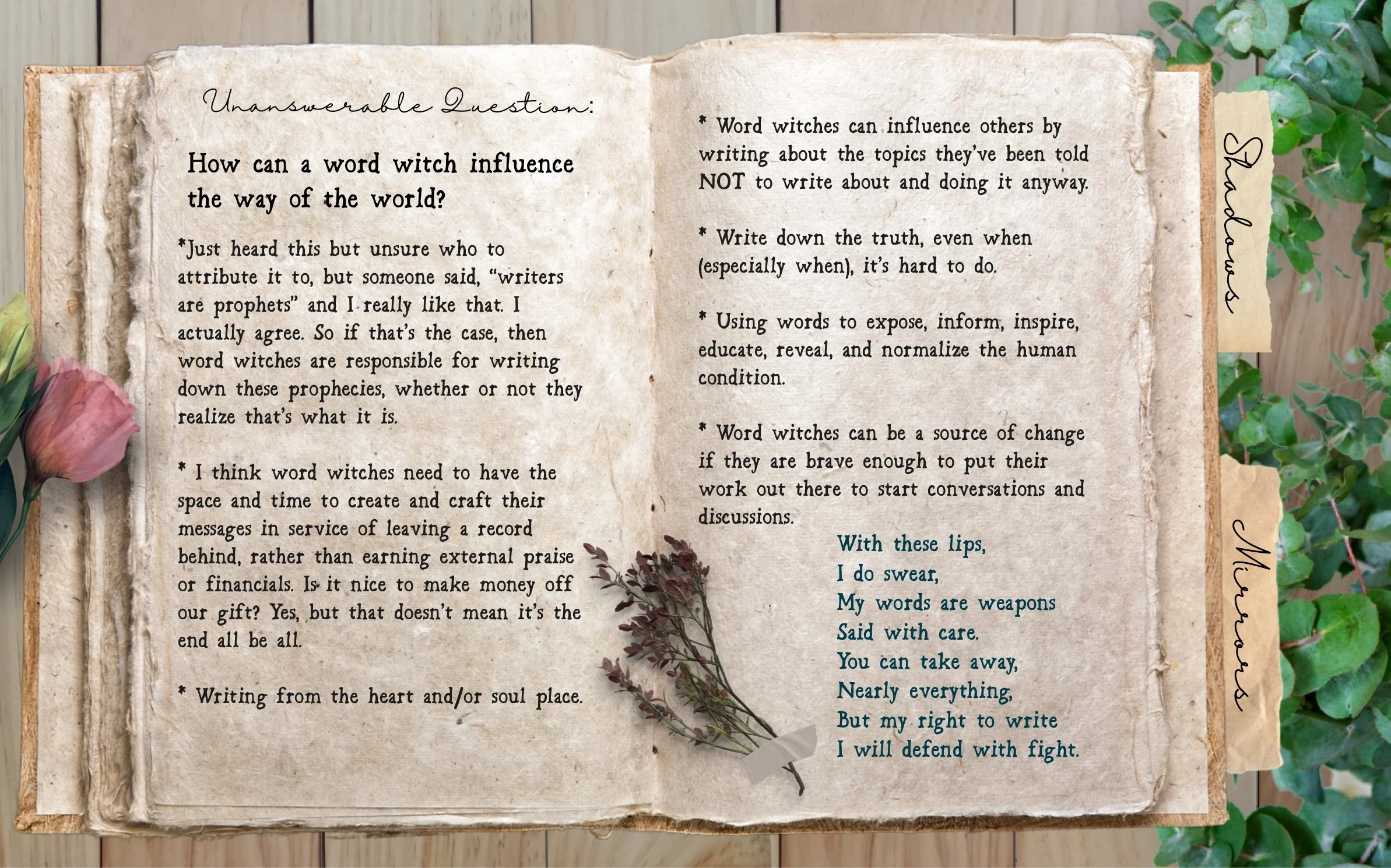 What’s unique about a word witch grimoire (and how I use it and teach about it) is that it encompasses all that makes up a writing life. And as we know — there’s more to our writing lives than just writing. So much of our writing is reflective of other parts of our lives. Our mental states, our triumphs, our failures, etc.