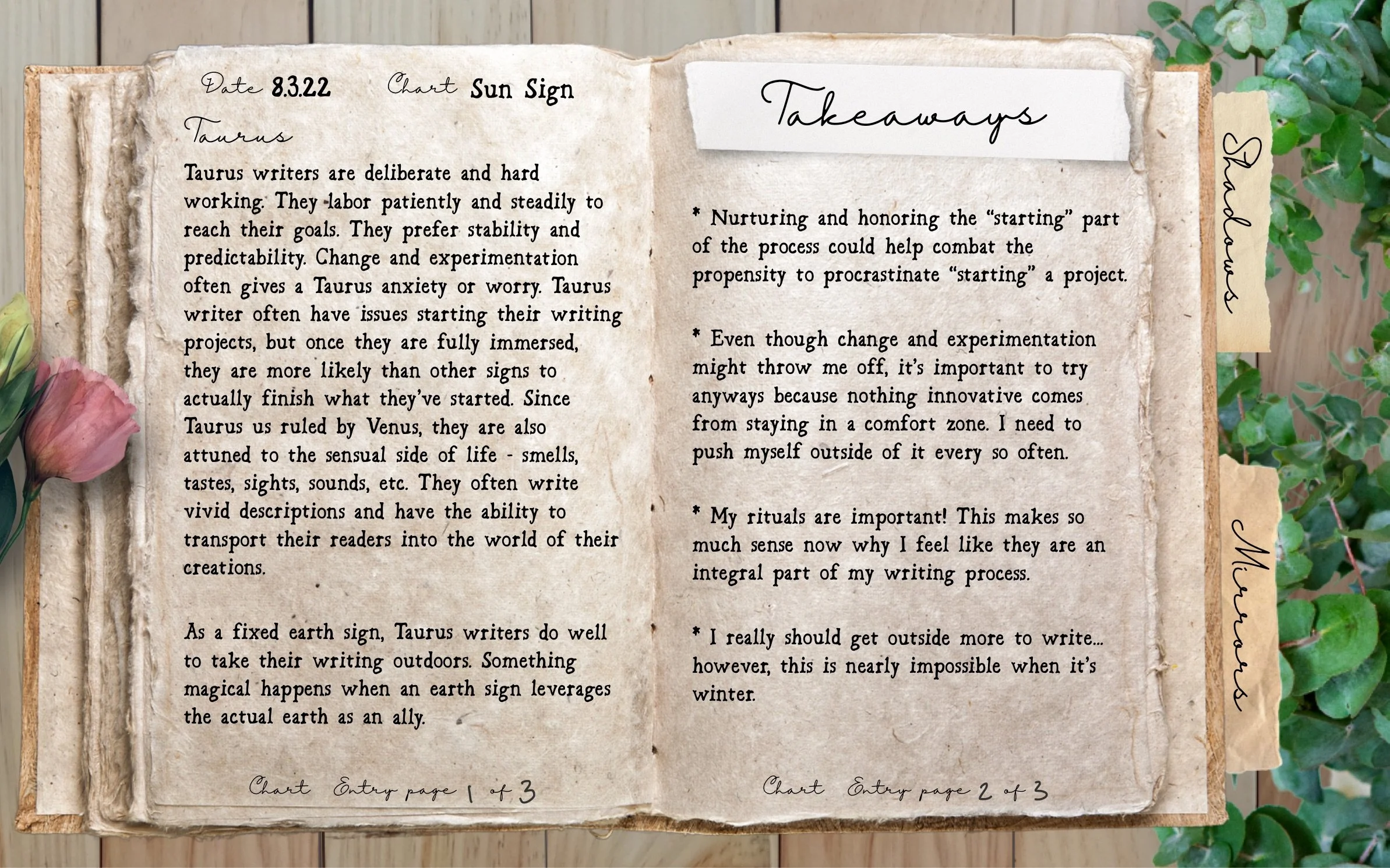 One of my favorite and most tangible ways to use my word witch grimoire is in what witches call “correspondences,” which is a fancy word for connections. Most people already do this without realizing it’s a “witch thing.” Take, for example, a sun sign. In my word witch grimoire, under “correspondences,” I have my sun sign listed (Taurus, representing) and what that means for me personally and writing-wise.