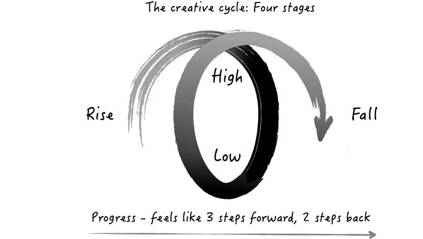 When I started researching and prepping for this article, I found numerous studies, opinion pieces, and articles about the creativity cycle, but it wasn’t exactly what I was looking for. Most of these pieces focused on a more logical cycle like this: