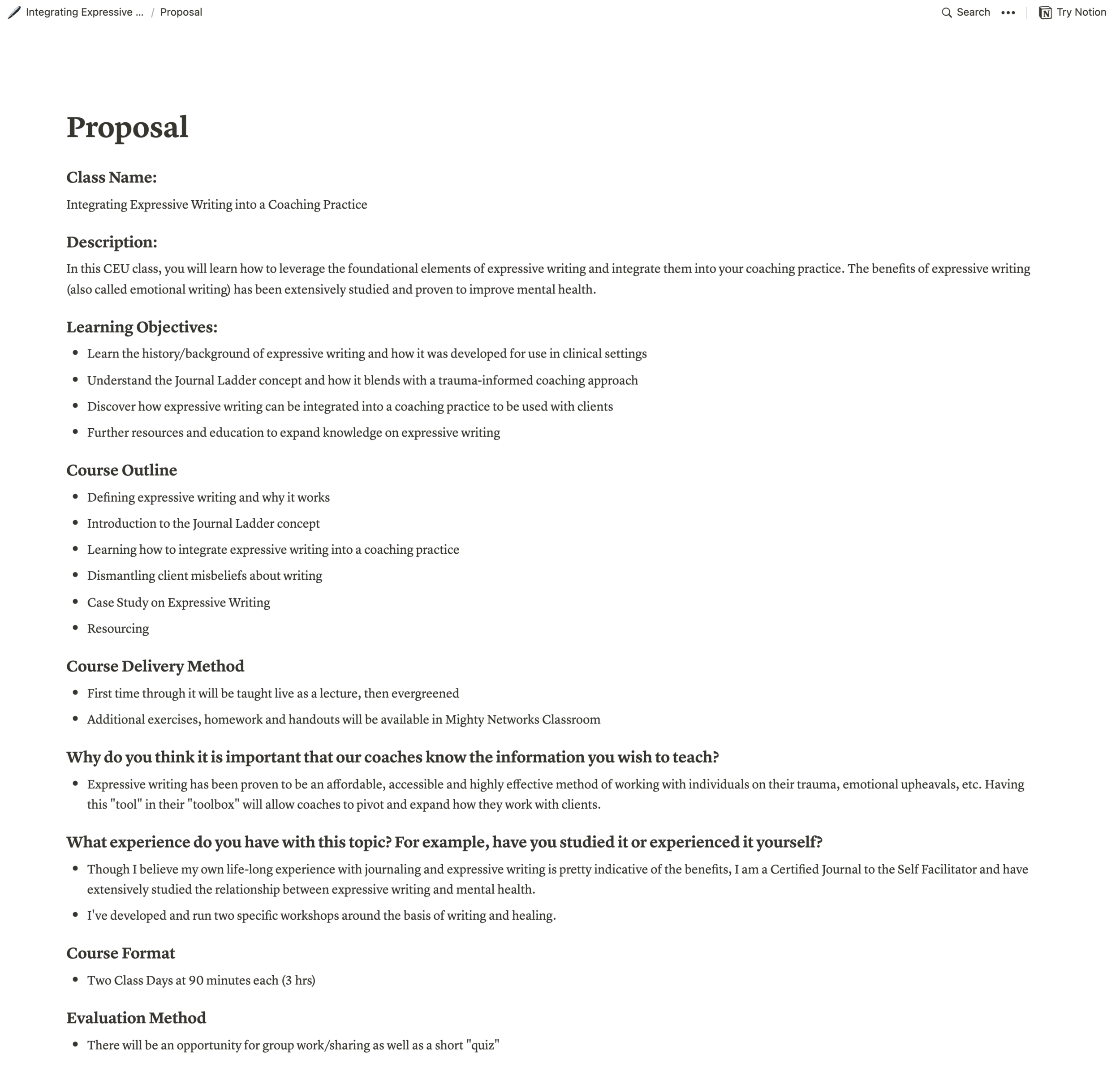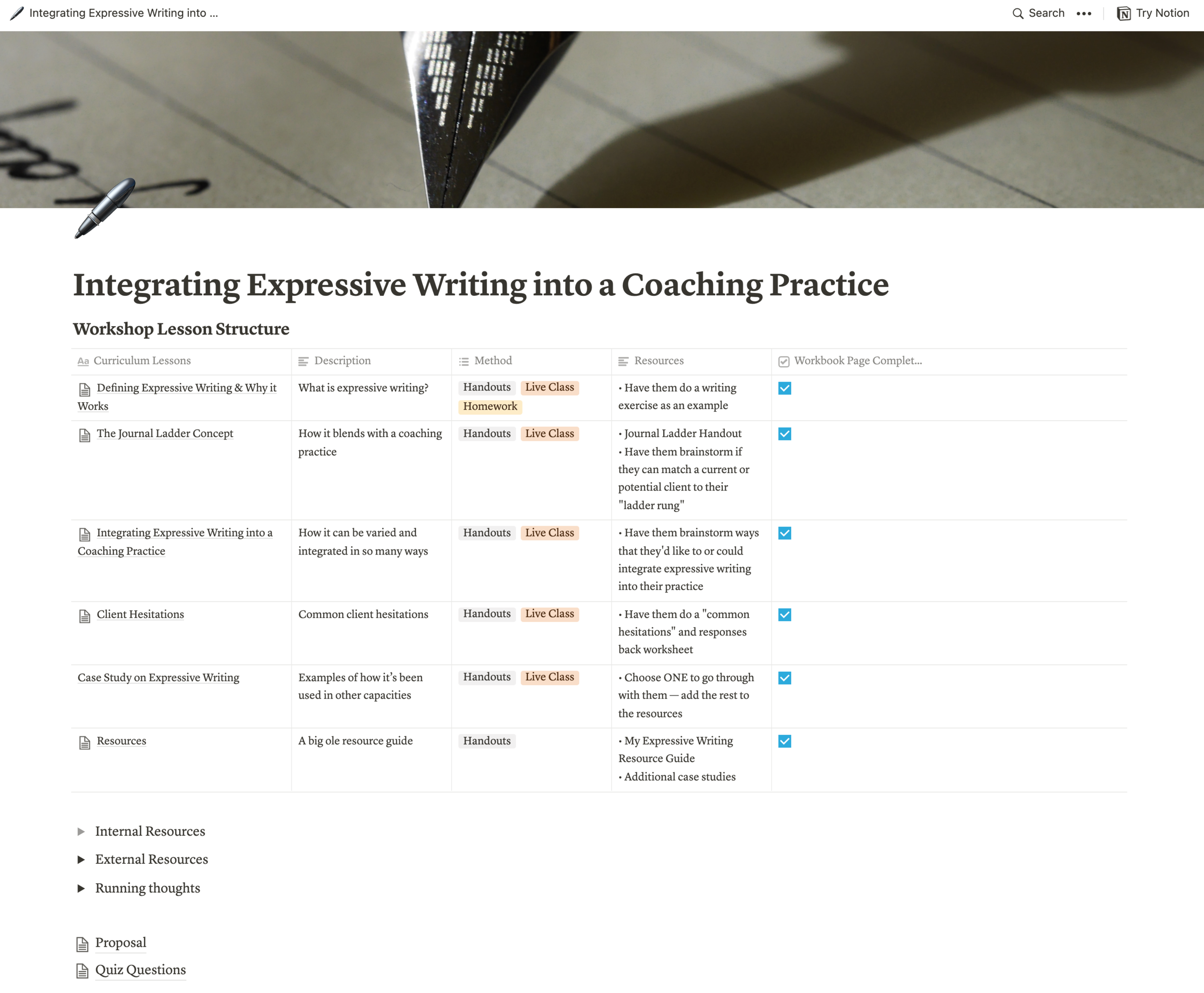 Last year, I created a workshop specifically for the students at the IAOTRC (International Association of Trauma Recovery Coaches) on integrating expressive writing into a coaching practice. I built the entire curriculum and its components in Notion.
