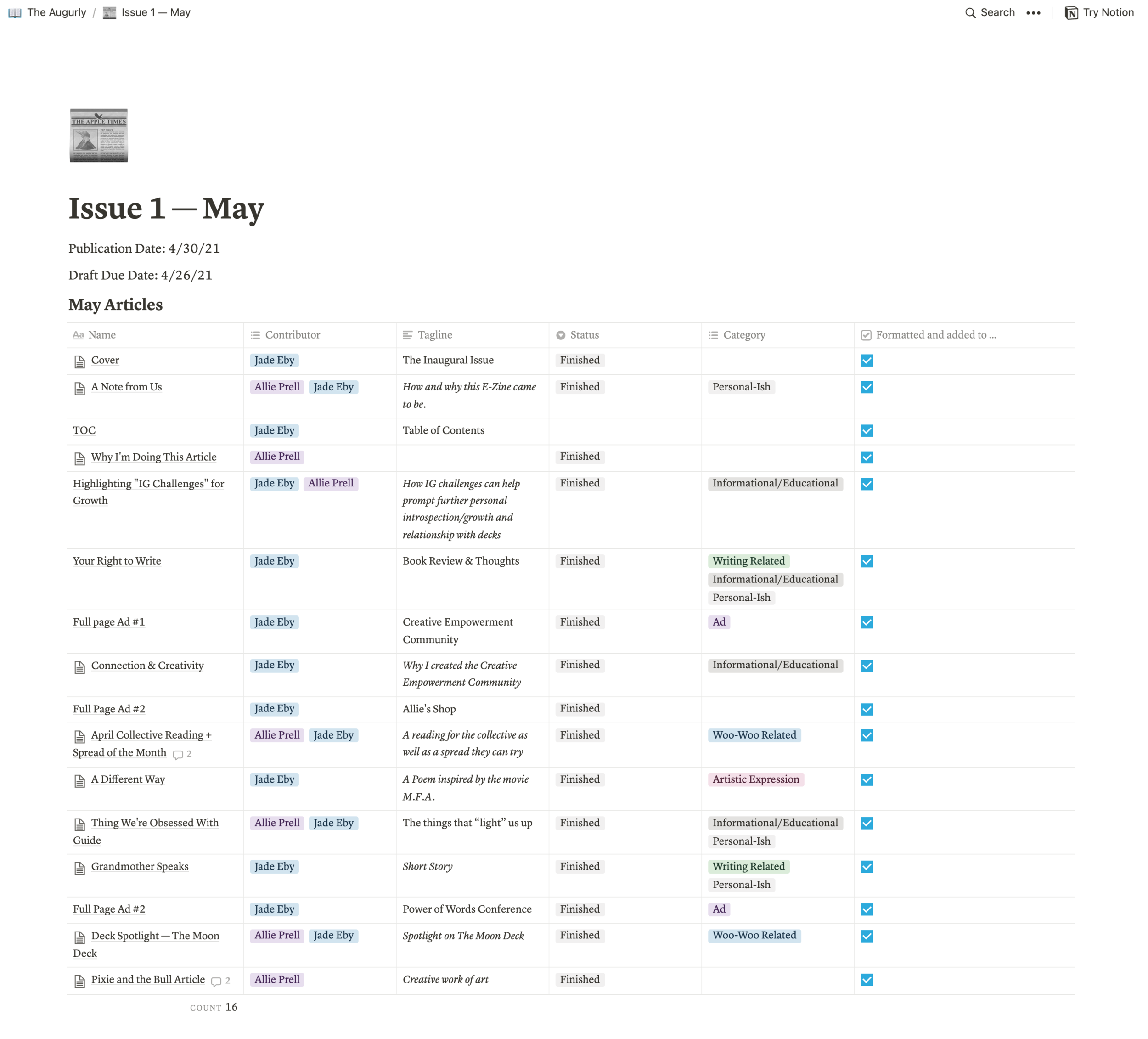Even before Allie and I decided to collaborate on The Augurly, I had set up a space to keep myself organized on the project. So it was easy to add her to the workspace I’d already set up. And I have to take a moment to praise Allie because I had her join the workspace and then set her to work — she had no training or knowledge of how to use Notion before I did this and she brilliantly took on the task of figuring out how to use it herself.